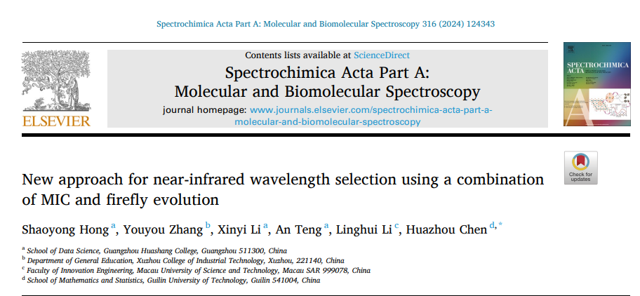近日,太阳成tyc33455cc教师洪绍勇以第一作者身份在《Spectrochimica acta. Part A, Molecular and biomolecular spectroscopy》期刊发表了题为“New approach for near-infrared wavelength selection using a combination of MIC and firefly evolution.”的论文,该期刊属于SCIE检索期刊,是JCR Q1分区,中科院二区。