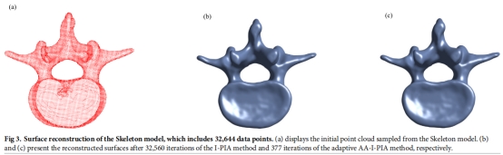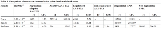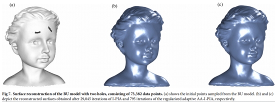 3.对于含噪声的点云数据,给出了正则化的自适应的隐式曲面重构的快速算法。