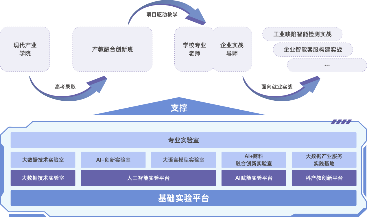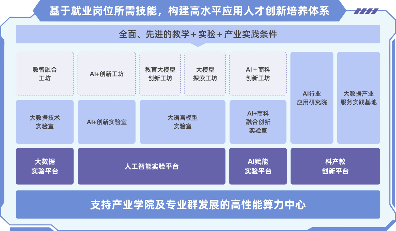 产业公司构建"基础实验-应用实战-产业服务"三级递进式实践教学体系,配备国际一流的算力资源、功能完备的教学实验平台、源自产业一线的AI与大数据课程资源,以及文心一言、DeepSeek等大语言模型的开发平台与私有化部署环境。通过整合国家级A类赛事专用设备、多场景专业教学仪器等资源,AI+创新实验室与AI+商科融合创新实验室提供跨行业应用场景实践案例及专业设备支持;大语言模型实验室则配备企业级全功能开发平台,支持大模型微调训练等产业级应用。由此形成的算力资源、产业课程、企业级开发平台、赛事支撑"四位一体"实验环境,使产业公司整体实验条件达到国内应用型本科院校领先水平。